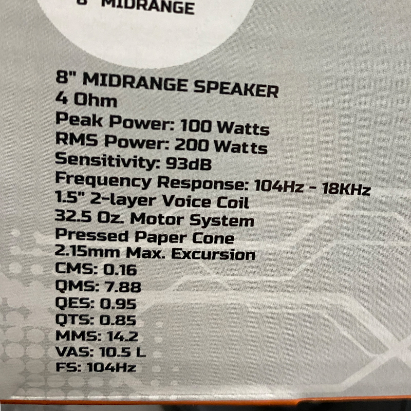 سایز: 8 اینچ برند : Alphasonic تعداد در هر جعبه 2 عدد توان خروجی مداوم 230 وات فرکانس پاسخ‌ گویی